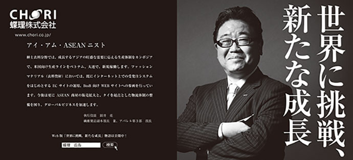 为配合中期经营计划“Chori Innovation Plan 2025”的发布,我们对广告进行了更新。广告标题为“蝶理的长处就是员工力量”,藉此凸显蝶理的优势,展现蝶理对于所经营的产品和服务充满热情的形象。